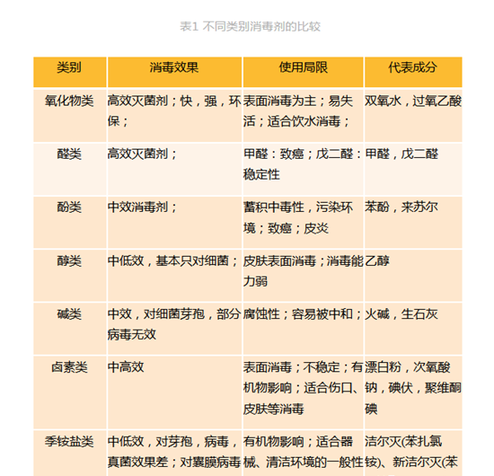 消毒劑的類型有很多,不同種類的消毒劑有不同的消殺譜和使用局限,比如說過氧化物類的消毒劑,雙氧水、過氧乙酸等,消毒譜廣,是高效滅菌劑,適用于飲水消毒。而國內豬場常用的燒堿,因為其強烈的腐蝕性,并不適用于豬場內部消毒。其他如次氯酸鹽因其消毒效果易受豬場有機物的影響而失去活性并且消毒效果不持久,使其使用范圍也受到局限(表1)