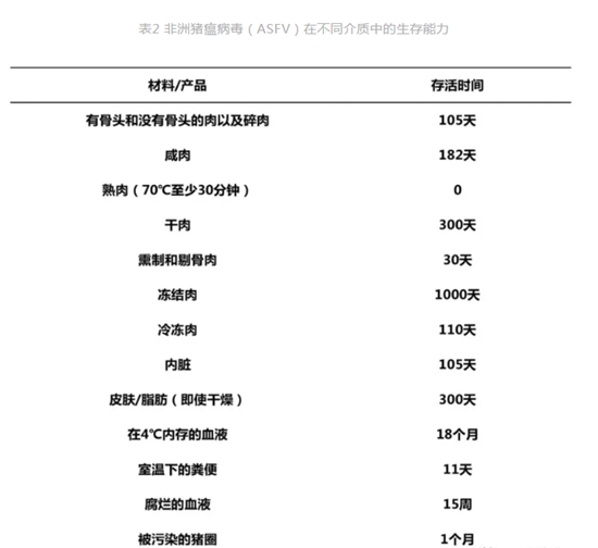 非洲豬瘟病毒屬有囊膜的DNA病毒,它不感染人,不會對公共衛生造成直接危害(EFSA,2009)。非洲豬瘟病毒有很強的體外生存能力,病毒存活能力強,在凍肉中可以存活數年到數十年,在未熟肉品,腌肉,泔水中也可長時間存活。病毒在60℃30分鐘或56℃70分鐘可被滅活。病毒在pH<3.9或>11.5無血清介質時可被滅活;血清增加,抵抗力增加,比如:在pH13.4時,無血清時可存活長達21小時,有血清時可存活7天。