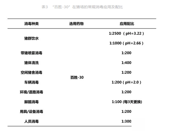 “百勝-30”消毒液在豬場應用于噴霧、飲水、浸泡和擦洗消毒等方式,常規消毒種類及配比見下表(表3)。