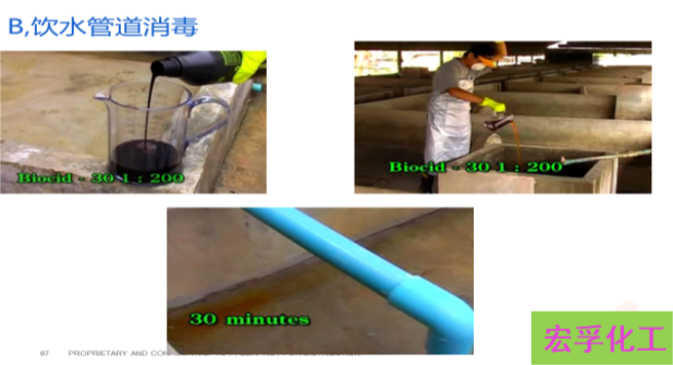 2)管道消毒。生物膜去除后,用1:200倍稀釋的百勝注入管道,作用30分鐘消毒飲水系統。再用清水沖洗。